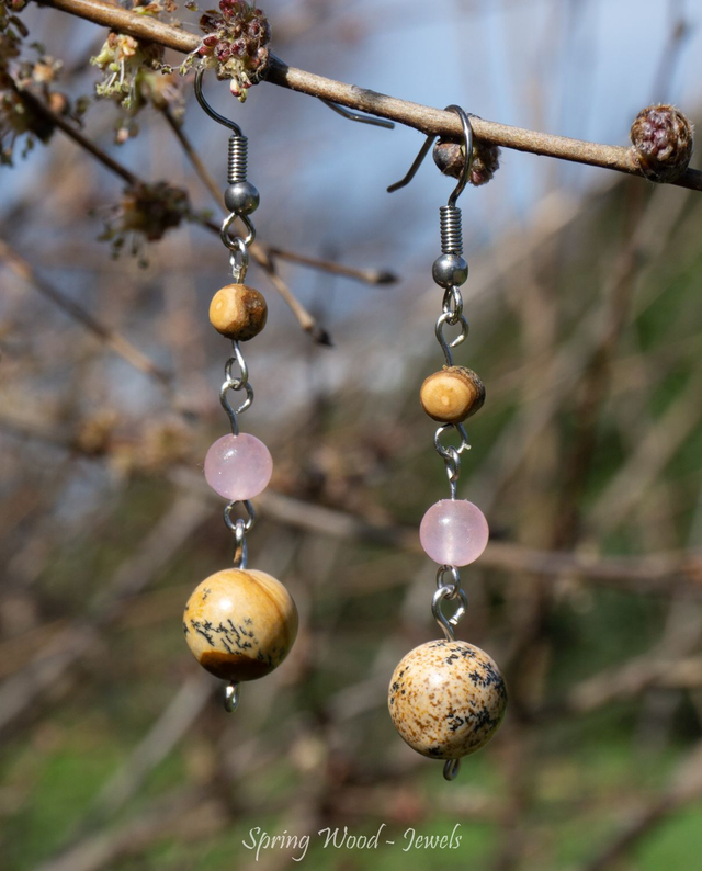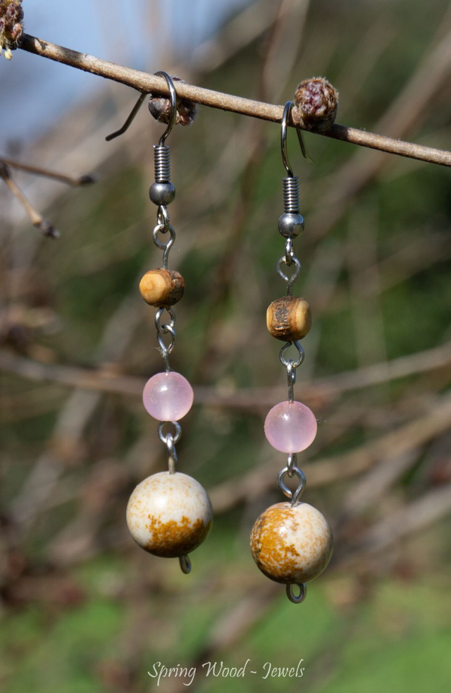 Le pietre sono in giada dendritica (la più grande, di diametro 10 mm) e in quarzo rosa (la più piccola, diametro 6 mm). L'altra perlina è ricavata da un ramoscello di ulivo ricavato da potature di una uliveta della via Francigena toscana..